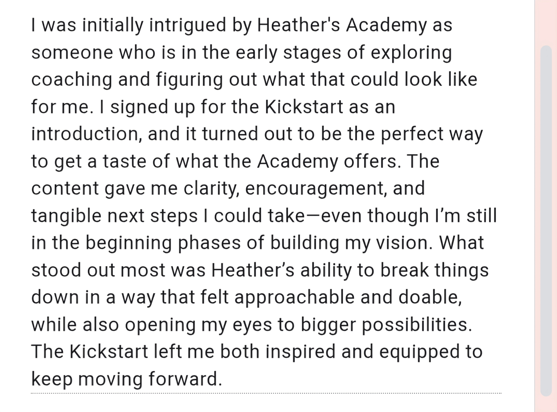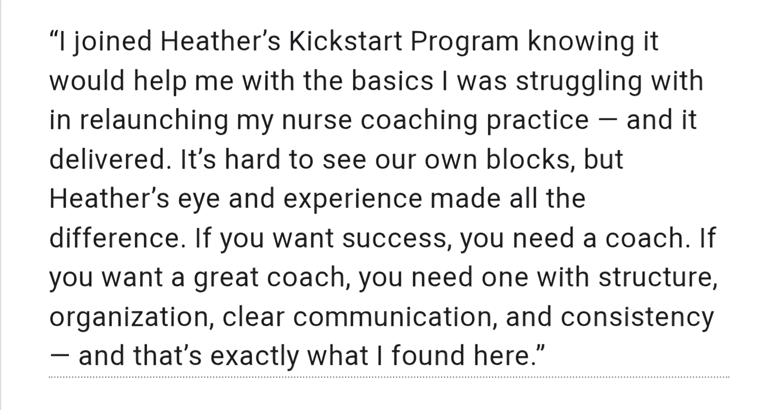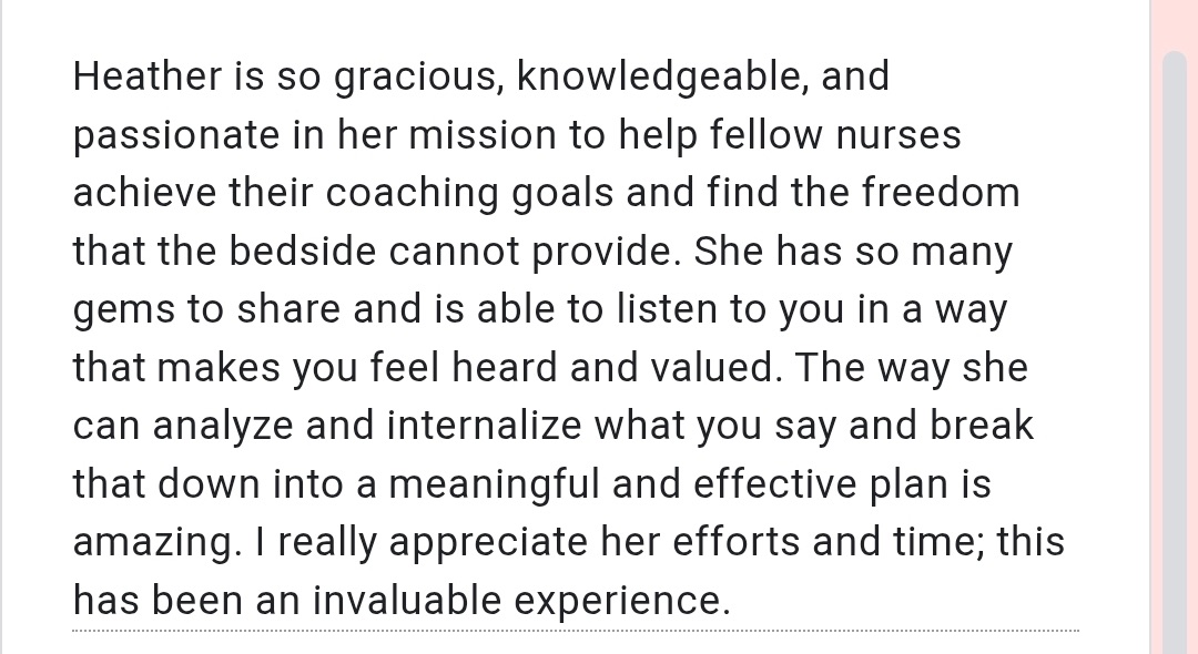 "Heather personally reached out to me via DM to ask how my business was doing. I told her that it wasn’t going well and that my current mentorship program that I invested an insane amount of money on wasn’t really helping me. When she invited me to her Revenue Accelerator program where she offered a one-week direct mentorship access to her, including two 1:1 coaching zoom calls for a reasonable price, I went for it because it was a no brainer. Heather answered my questions quickly and offered very practical and useful advice that saves money. She was very positive and encouraging and I really felt like she cared about me and truly wanted to help me succeed. When I opened to her about my fears and worries about getting in so much debt trying to bet on myself with starting an online coaching business, she was very encouraging and made me feel seen, heard and understood. Since she was also a nurse and used to be in my shoes, she knew how to relate to me and my current mindset and fears during my transition from bedside nursing to online health coaching. We shared the same Christian values, and I just knew in my heart she was someone I could trust and felt very strongly that I needed her in my corner to help me succeed. From there, she helped me find ways to be able to afford her Nurse to Coach Academy, and just like that, I’m in! I’m so excited to finally have the support and accountability that I need to help me launch my business and be well prepared to start helping people, which is why I wanted to do health coaching in the first place. Thank you, Heather, for being the light I need to guide me in this journey of entrepreneurship!”